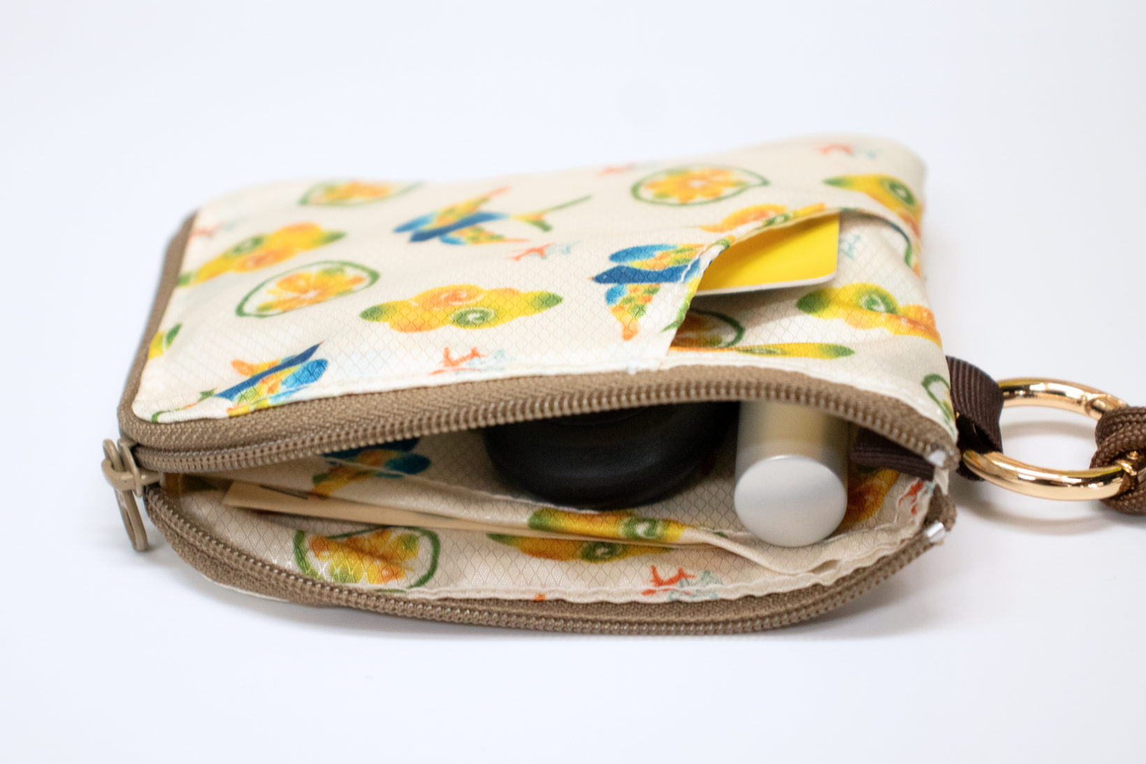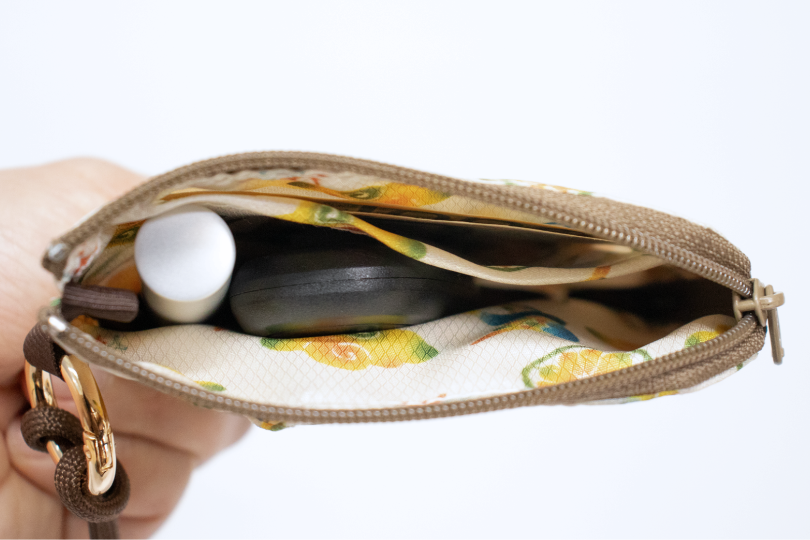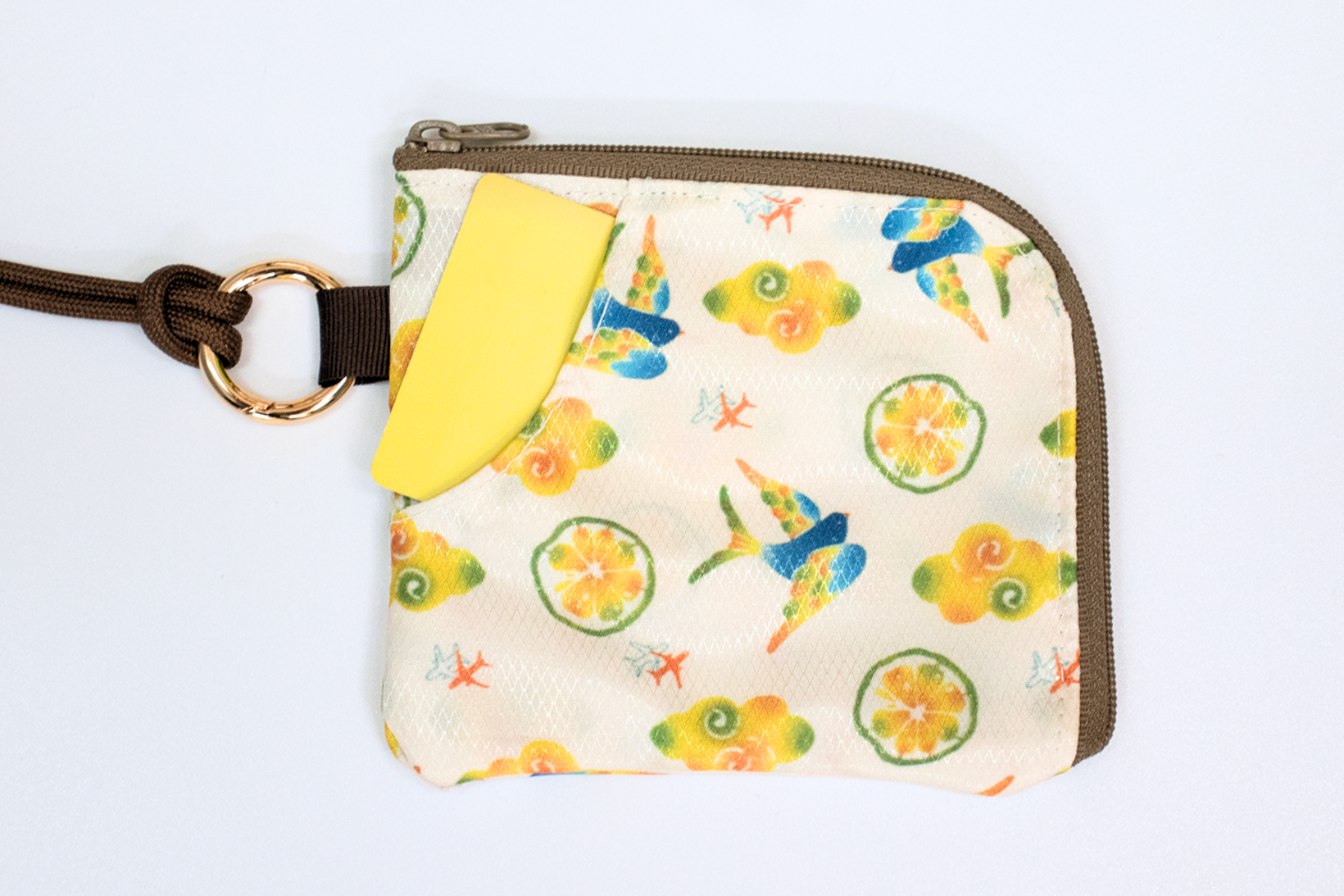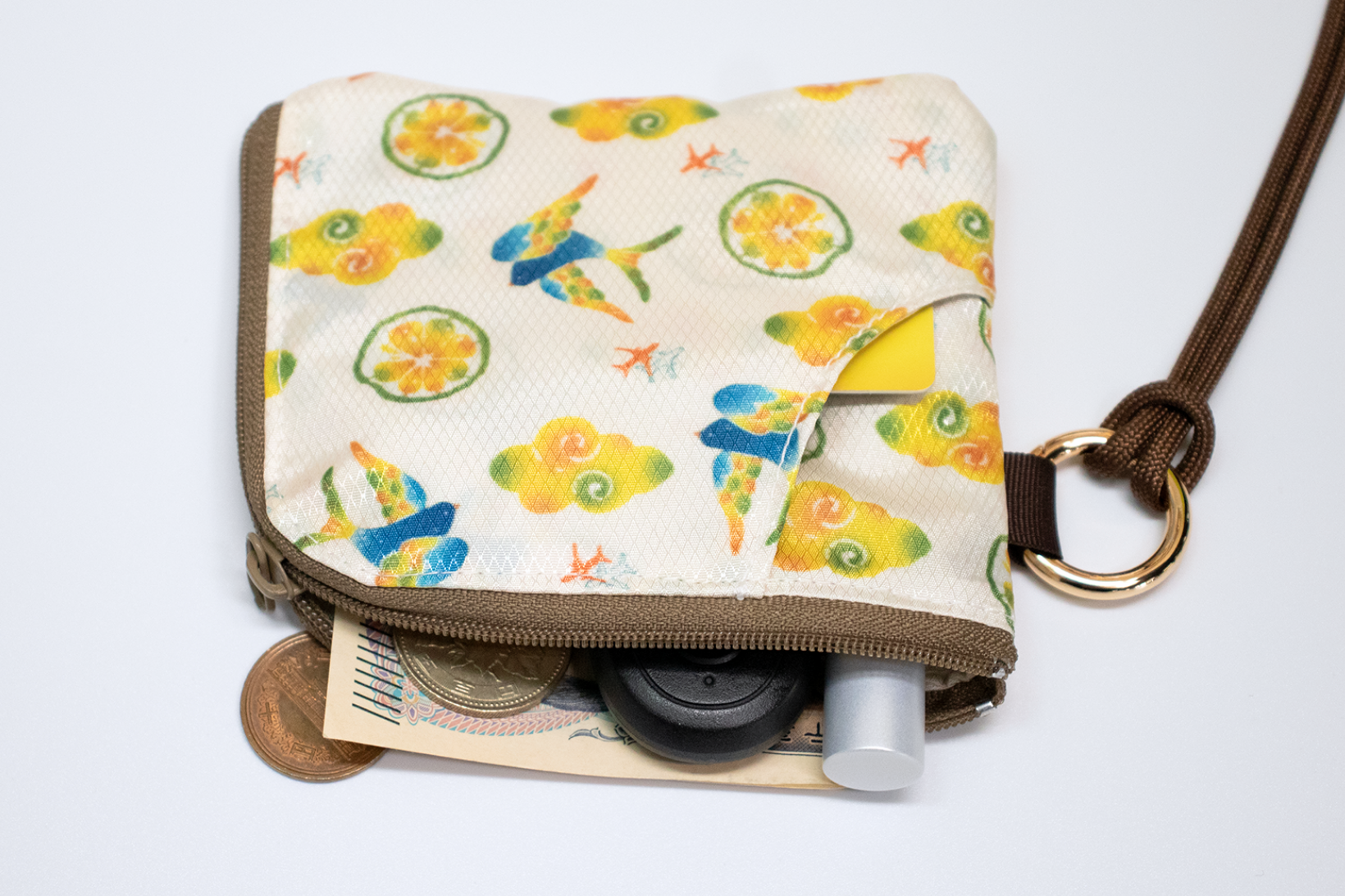 旅先でも日常でも便利に使える軽量ポーチ。外ポケットはカードが入るサイズです(※カードは逆さにすると落ちる可能性がありますのでご注意ください)。