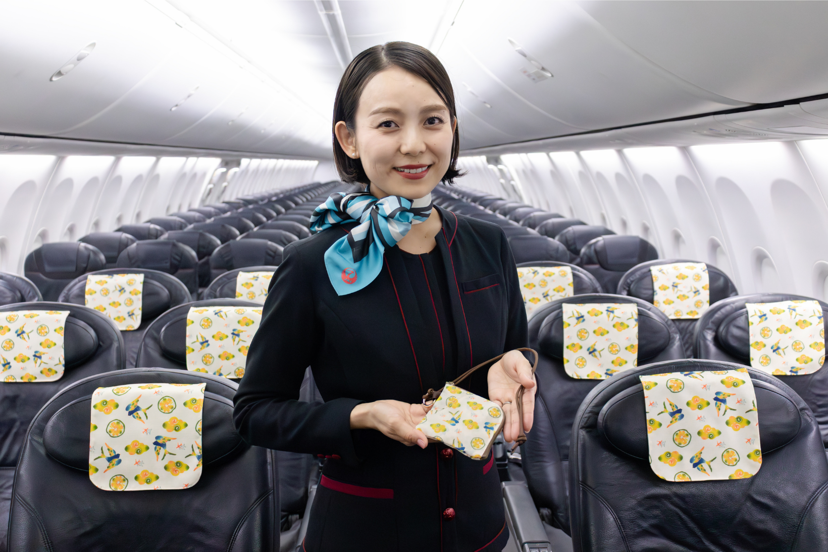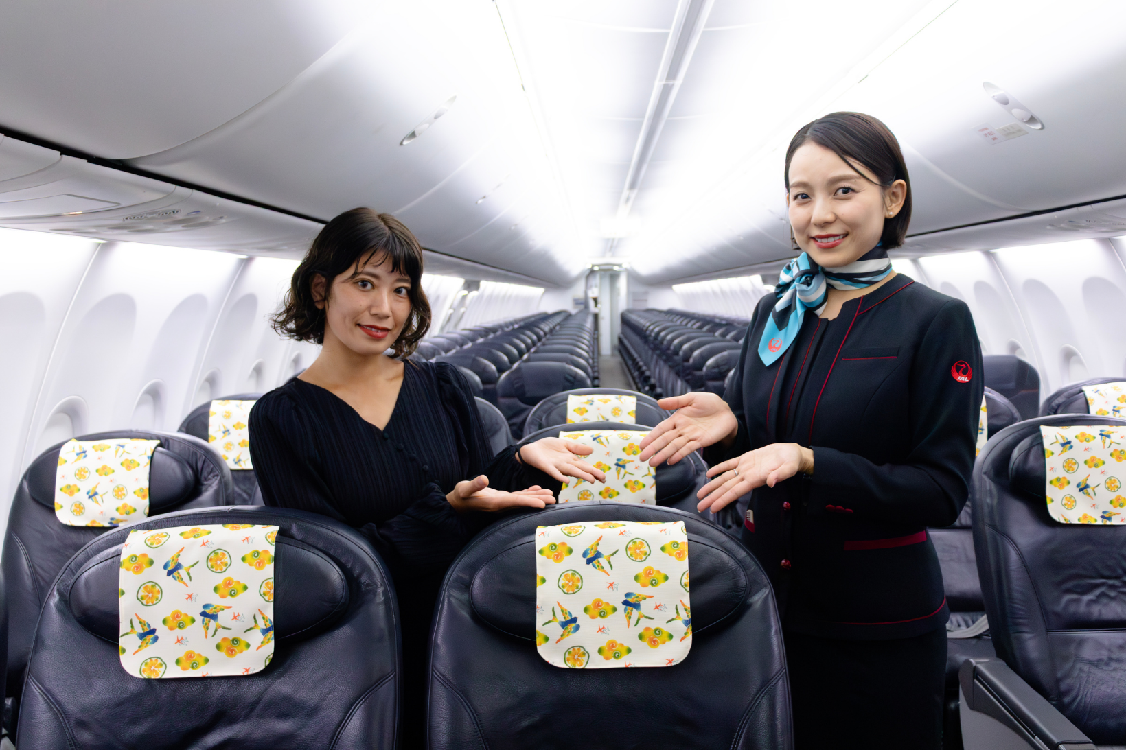 JTAのヘッドレストカバー第13弾「楽園へ飛んだ日」は、2025年11月~2026年4月の間、JTA機内のクラスJにてお楽しみいただけます。