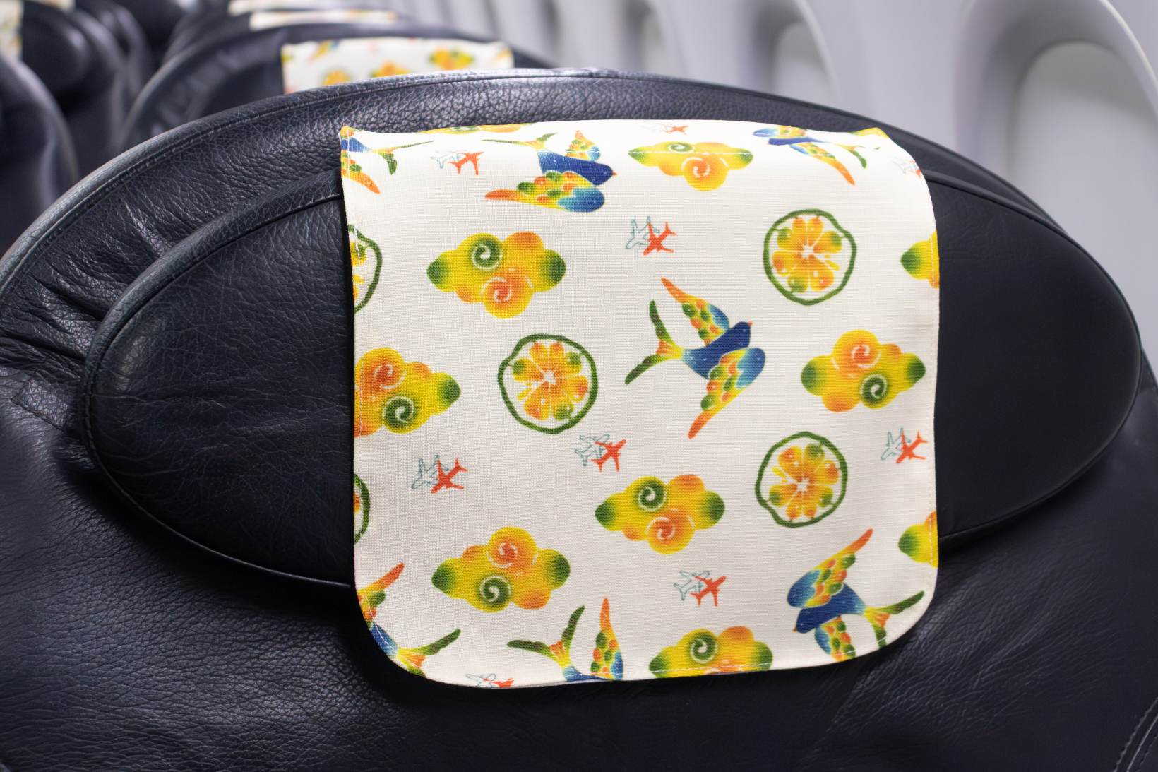 図柄は日本トランスオーシャン航空(JTA)クラスJのヘッドレストカバーと同じ、崎山ハナエさんの「楽園へ飛んだ日」です。